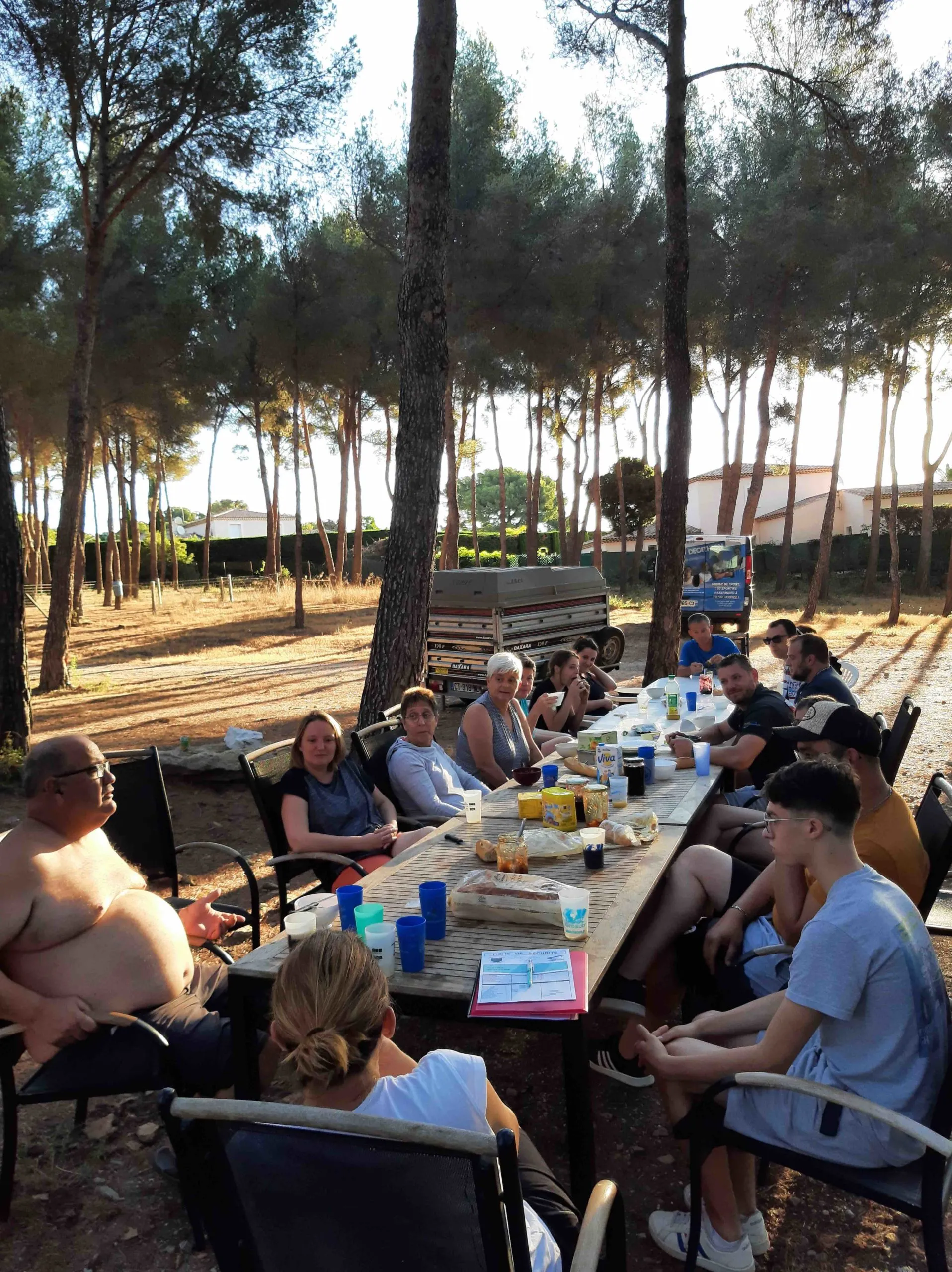 Déchargement des bagages, des courses… Et hop hop, des omelettes avec champignons ou sans champignons cuisinés par Romain et toupetit…. Ça discute, ça rigole ! Cette bonne ambiance est accompagnée par le chant des cigales !
